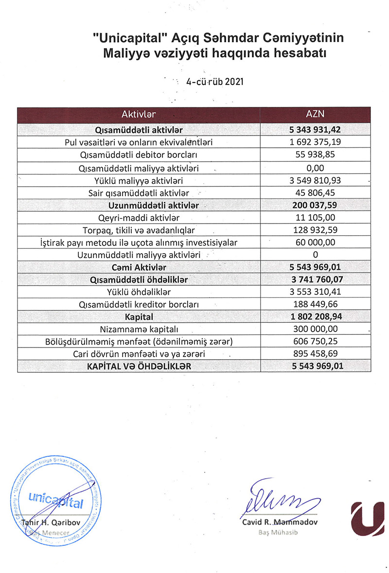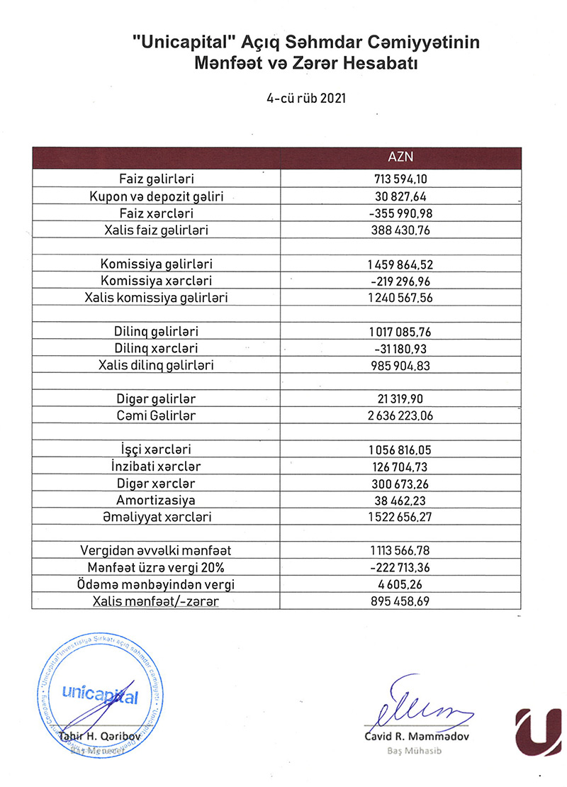 "Unicapital İnvestisiya Şirkəti" audit təsdiqli illik hesabatına görə, şirkət 2020-ci ili 521 min manat xalis mənfəət ilə bağlayıb.