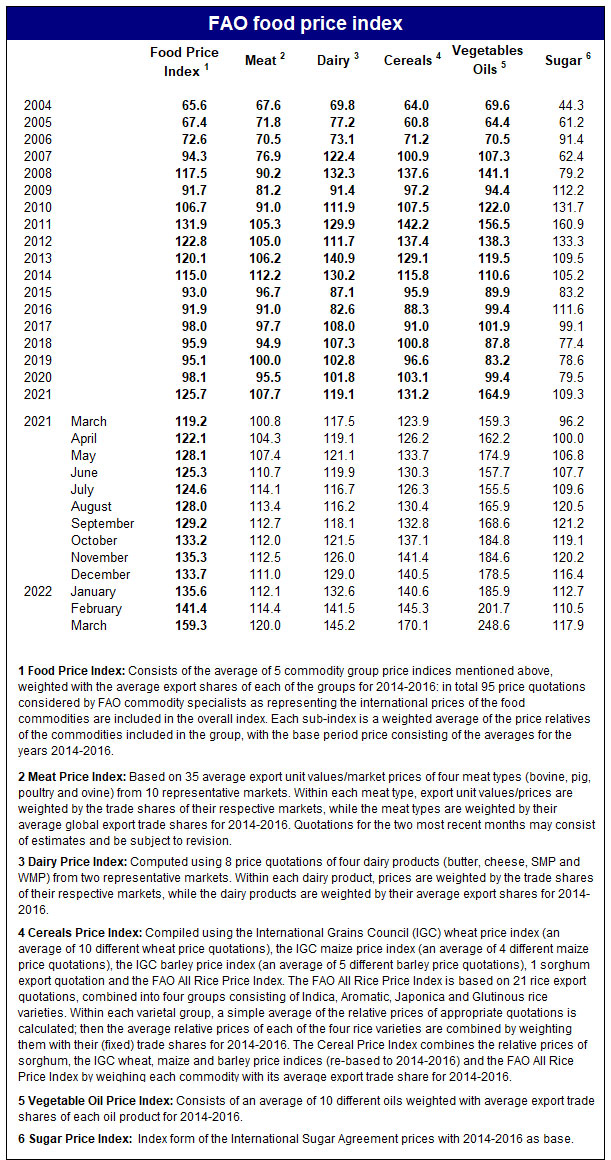 FAO-nun Taxıl Qiymətləri İndeksi mart ayında 17,1 faiz artaraq 170,1 bənd təşkil edib ki, bu da 1990-cı ildən bəri rekord göstəricidir. Bu ayın artımı əsasən Ukrayna-Rusiya müharibəsilə əlaqədar olaraq ixracın kəsilməsi nəticəsində buğda qiymətlərinə artan təzyiqdən irəli gəlir. Qara dəniz regionundan gözlənilən ixrac itkisi vəziyyəti daha da pisləşdirib.