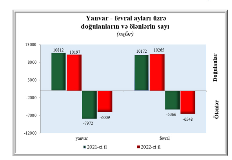 Ədliyyə Nazirliyinin rayon (şəhər) qeydiyyat şöbələri tərəfindən cari ilin ilk iki ayı ərzində 20 min 462 doğulan körpə qeydə alınmış və əhalinin hər 1000 nəfərinə bu göstərici 12,6 təşkil etmişdir. Doğulanlar arasında oğlanların xüsusi çəkisi 53,3 faiz, qızların xüsusi çəkisi isə 46,7 faiz olmuşdur. Körpələrdən 616-sı əkiz, 33-ü isə üçəm doğulanlardır.