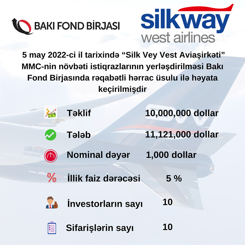 5 may 2022-ci il tarixində Bakı Fond Birjasında “Silk Vey Vest Aviaşirkəti” MMC-nin tədavül müddəti 3 (üç) təqvim ili olan AZ2003023515 dövlət qeydiyyat nömrəli, 10 milyon ABŞ dolları həcmində, faizli, təmin edilməmiş sənədsiz, adlı istiqrazlarının yerləşdirilməsi üzrə hərrac yekunlaşıb.