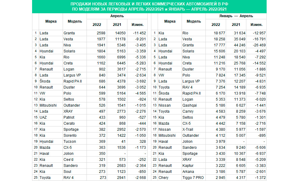 Ayrı-ayrı modellərə gəlincə, aprel ayında "bestseller"lər arasında ilk üç yeri AvtoVAZ modelləri tutub: Lada Granta (2598 ədəd), Lada Vesta (1977 ədəd) və Lada Niva (1941 ədəd). Dördüncü və beşinci yerlərdə müvafiq olaraq 1804 ədəd və 1660 ədəd satılan Cənubi Koreyanın Hyundai Solaris və Kia Rio modelləri var.