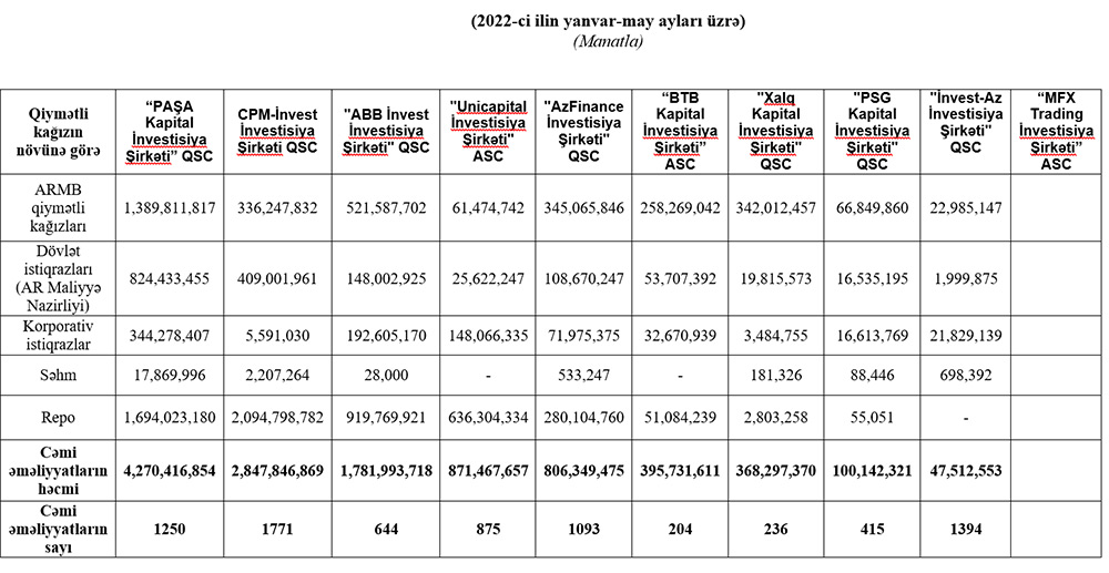 Marja.az xəbər verir ki, 2022-ci ilin yanvar-may ayları üzrə də “PAŞA Kapital İnvestisiya Şirkəti” QSC 4 milyard 270 milyon 417 min manat dövriyyə ilə 1-ci, CPM-İnvest İnvestisiya Şirkəti QSC 2 milyard 847 milyon 847 min manat dövriyyə ilə 2-ci, "ABB İnvest İnvestisiya Şirkəti" QSC 1 milyard 781 milyon 994 min manat dövriyyə ilə 3-cü yeri tutub.