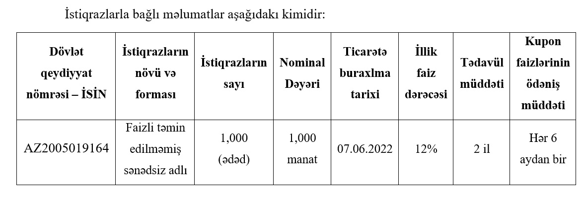 Birjanın yaydığı məlumata görə, faizli təmin edilməmiş sənədsiz adlı istiqrazların sayı 1000 ədəd, hər birinin nominal dəyəri 1000 manat, illik faiz dərəcəsi 12%, tədavül müddəti 2 il, kupon faizlərinin ödəniş müddəti hər 6 aydan birdir.