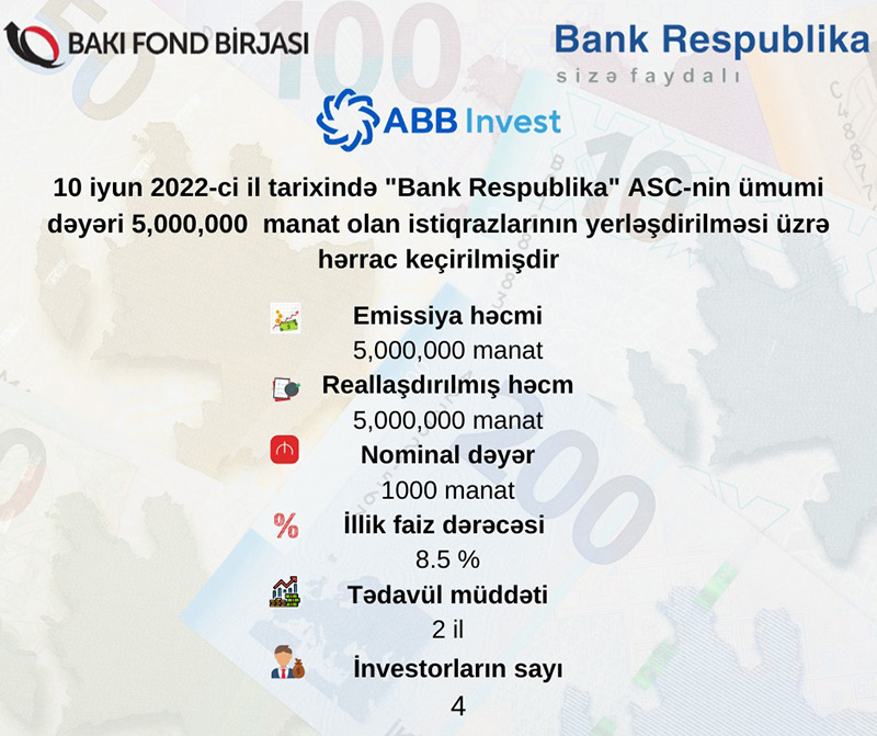 10 iyun 2022-ci il tarixində Bakı Fond Birjasında "Bank Respublika" ASC-nin tədavül müddəti 2 təqvim ili olan AZ2006002888 dövlət qeydiyyat nömrəli, 5 milyon manat həcmində, faizli, təmin edilməmiş sənədsiz, adlı istiqrazlarının yerləşdirilməsi üzrə hərrac yekunlaşıb.