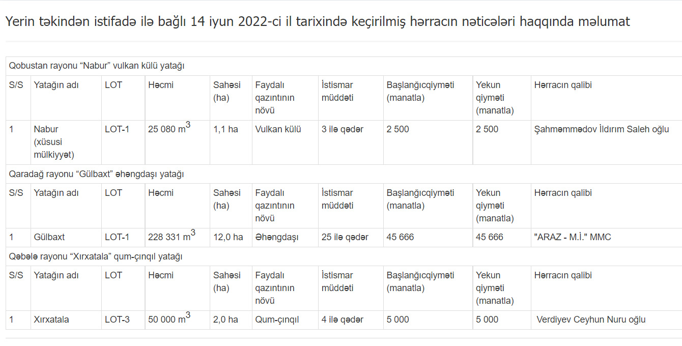 Hərracda Qobustan rayonunda yerləşən “Nabur” vulkan külü yatağının 1,1 hektar sahəsi, Qaradağ rayonunun “Gülbaxt” əhəngdaşı yatağının 12 hektar sahəsi və Qəbələdə yerləşən “Xırxatala” qum-çınqıl yatağının 2 hektar sahəsi istifadəyə verilib.