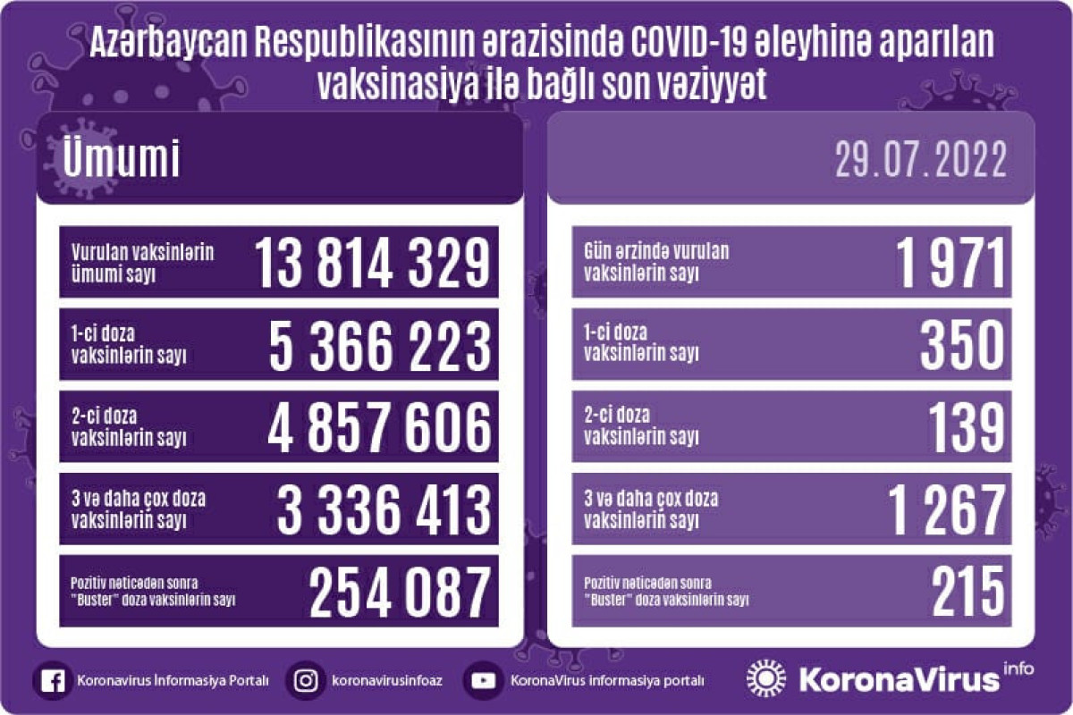 Azərbaycanda son sutkada koronavirus (COVID-19) əleyhinə 1971 vaksin vurulub. Bir gündə birinci mərhələ üzrə vaksinasiya olunanların sayı 350, ikinci mərhələ üzrə vaksinasiya olunanların sayı 139, üç və daha çox doza üzrə vaksinasiya olunanların sayı 1 267, pozitiv nəticədən sonra buster doza üzrə vaksinasiya olunanların sayı 215 nəfərdir.