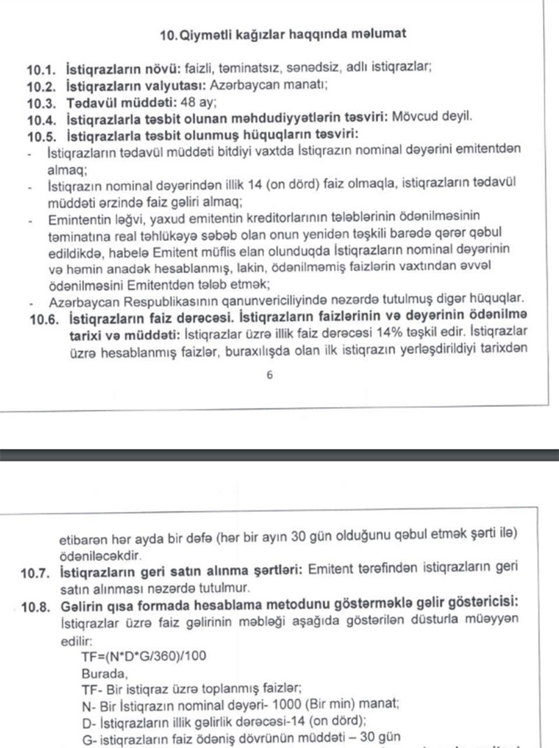 İstiqrazı əldə edəcək investorlara 14% gəlir təklif olunur. Faizlər ayda bir dəfə ödəniləcəkdir. İstiqrazların tədavül müddəti 48 aydır.