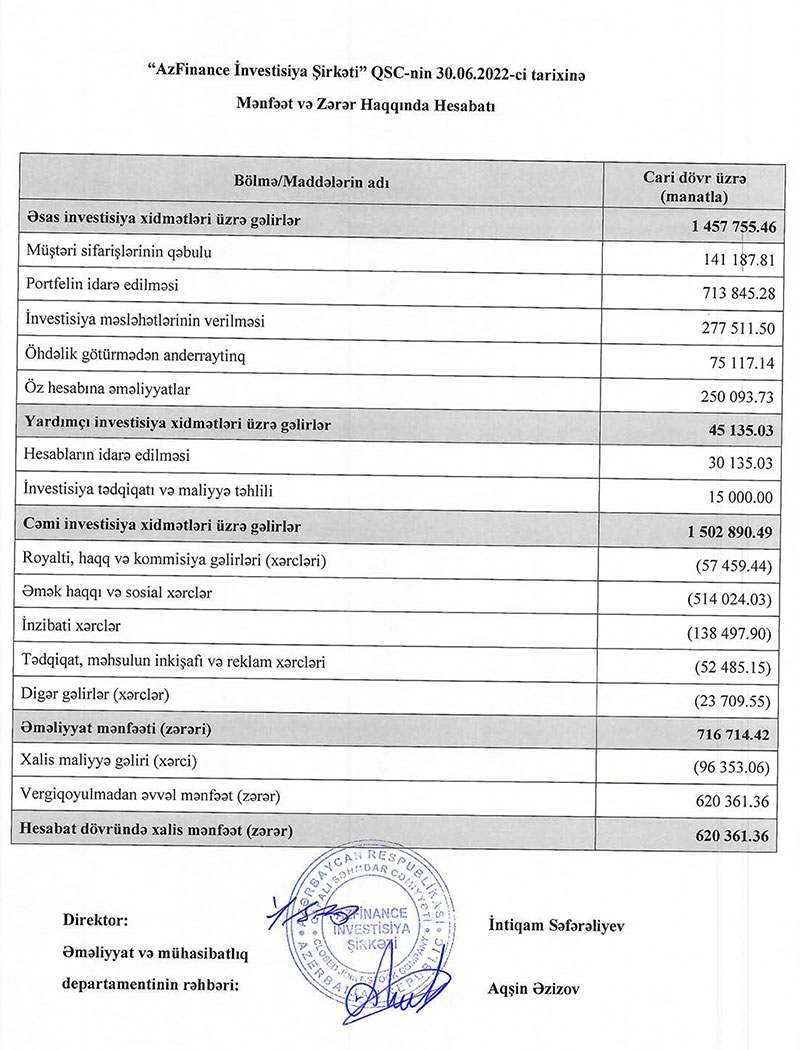 "AzFinance İnvestisiya Şirkəti" QSC 2022-ci ilin birinci yarısını 620 min 360 manat xalis mənfəət ilə başa vurub.
