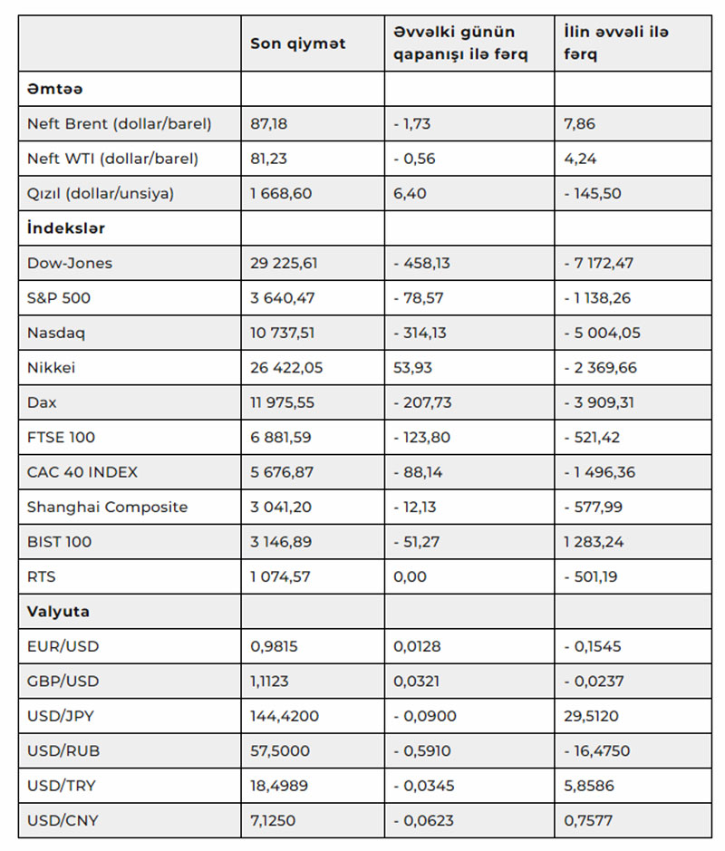 Beynəlxalq əmtəə, fond və valyuta bazarlarının göstəriciləri (30.09.2022)