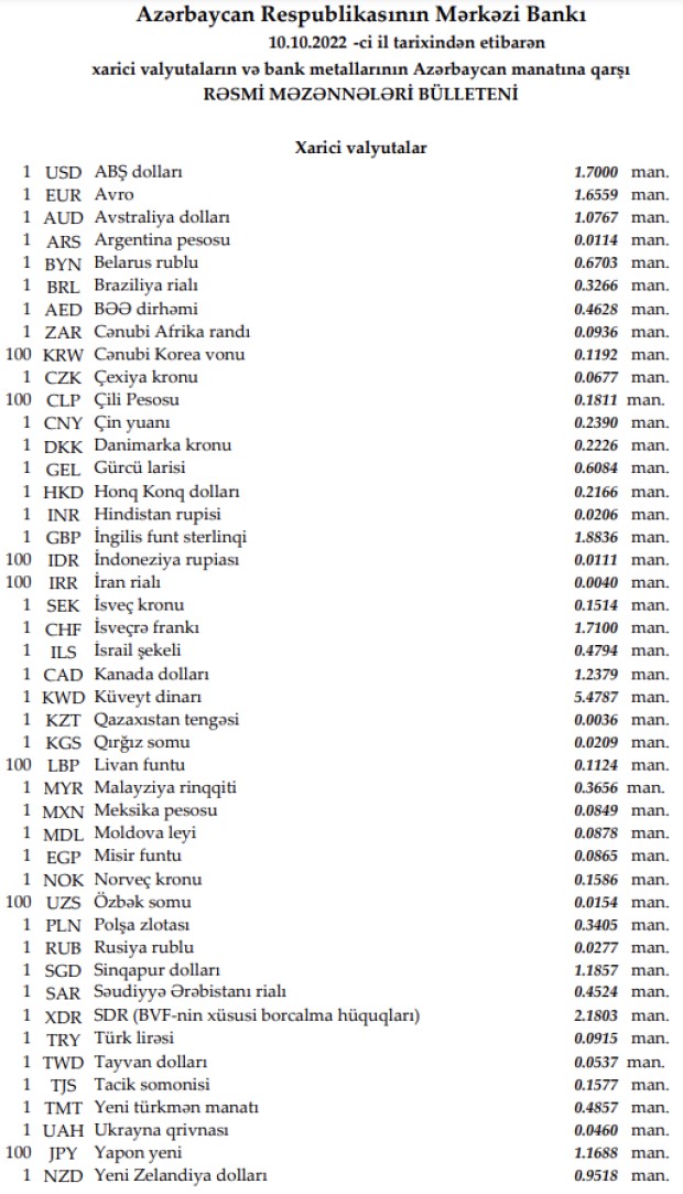 Rəsmi məzənnələr açıqlandı