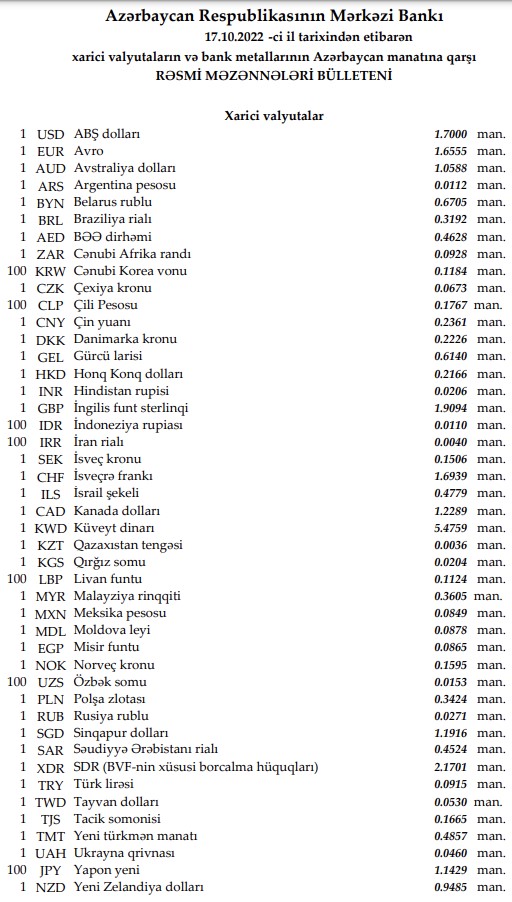 Rəsmi məzənnələr açıqlandı