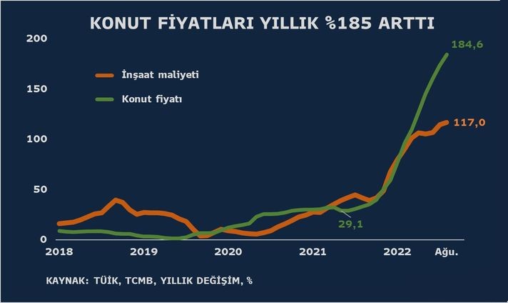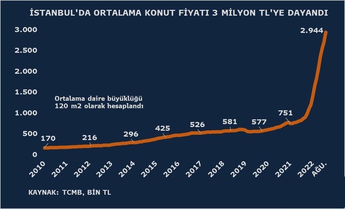 Türkiyə Respublikası Mərkəzi Bankının (TCMB) avqust ayı mənzil qiymətləri indeksinə görə, qiymətlər 2021-ci ilin avqust ayı ilə müqayisədə 185% artıb. İstanbulda eyni dövrdə mənzil qiymətləri 211% artıb. Avqust ayında İstanbulda mənzilin bir kvadrat metrinin orta qiyməti 24 min 533 türk lirəsi (TL) olub.Türkiyədə mənzil qiymətlərində artım tempi Avqust ayında da davam edib və artımda yeni rekord qeydə alınıb.