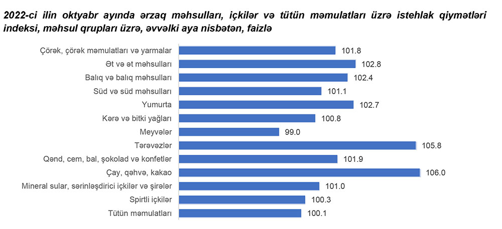 2022-ci ilin oktyabr ayında ərzaq məhsulları, içkilər və tütün məmulatları üzrə istehlak qiymətləri indeksi əvvəlki aya nisbətən 2,2 faiz, əvvəlki ilin oktyabr ayına nisbətən 21 faiz artıb.