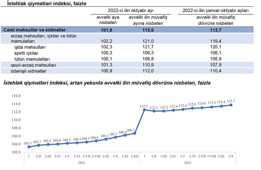2022-ci ilin yanvar-oktyabr aylarında istehlak qiymətləri indeksi (inflyasiya göstəricisi) 2021-ci ilin yanvar-oktyabr aylarına nisbətən 13,7 faiz, o cümlədən ərzaq məhsulları, içkilər və tütün məmulatları üzrə 19,4 faiz, qeyri-ərzaq məhsulları üzrə 7,9 faiz, əhaliyə göstərilmiş ödənişli xidmətlər üzrə 10,4 faiz artıb.