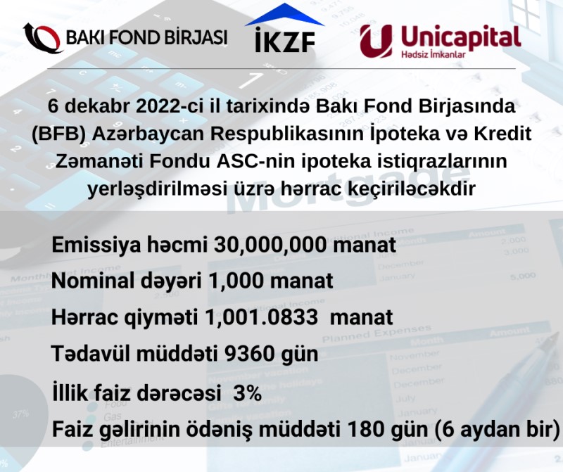 6 dekabr 2022-ci il tarixində Bakı Fond Birjasında (BFB) Azərbaycan Respublikasının İpoteka və Kredit Zəmanəti Fondu ASC-nin ipoteka istiqrazlarının yerləşdirilməsi üzrə hərrac keçiriləcəkdir.