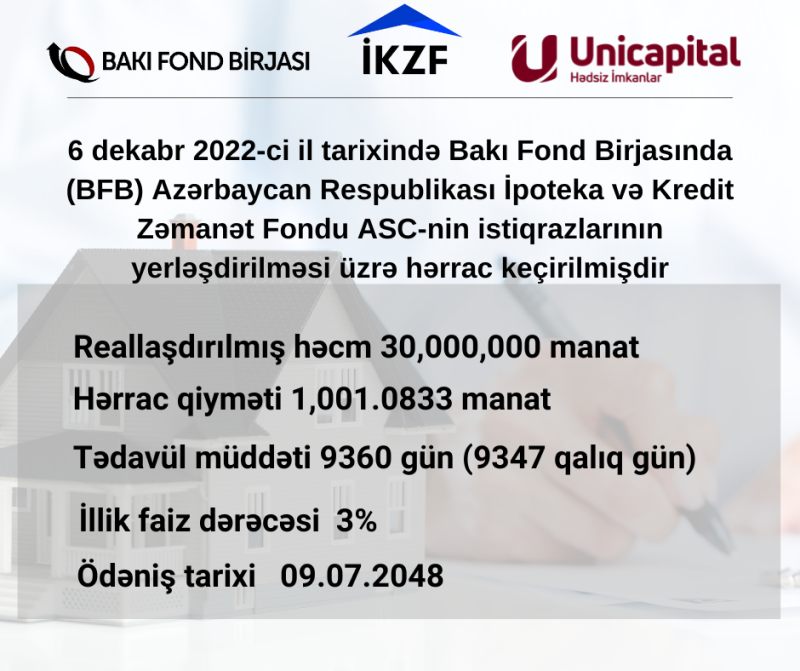 6 dekabr 2022-ci il tarixində Bakı Fond Birjasında Azərbaycan Respublikası İpoteka və Kredit Zəmanət Fondu ASC–nin AZ2069008681 ISIN-li, 30 milyon manat həcmində, tədavül müddətli 9360 gün (9347 qalıq gün) olan istiqrazlarının yerləşdirilməsi üzrə hərrac yekunlaşıb.