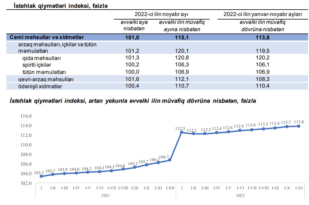 Azərbaycanda 12 aylıq inflyasiya 15,6%-dən 15,1%-ə geriləyib.2022-ci ilin yanvar-noyabr aylarında istehlak qiymətləri indeksi (inflyasiya göstəricisi) 2021-ci ilin yanvar-noyabr aylarına nisbətən 13,8 faiz, o cümlədən ərzaq məhsulları, içkilər və tütün məmulatları üzrə 19,5 faiz, qeyri-ərzaq məhsulları üzrə 8,3 faiz, əhaliyə göstərilmiş ödənişli xidmətlər üzrə 10,4 faiz artıb.