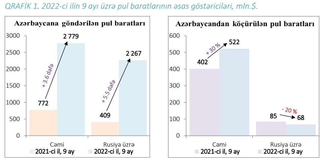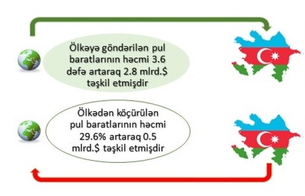 Ölkəyə göndərilən pul baratlarının həcmi 3.6 dəfə artaraq 2.8 milyard dollar, ölkədən köçürülən pul baratlarının həcmi isə 29.6% artaraq 522 milyon dollar (0,5 milyard dollar) olmuşdur. Nəticədə pul baratları üzrə 2.3 milyard dollar müsbət saldo yaranmışdır.