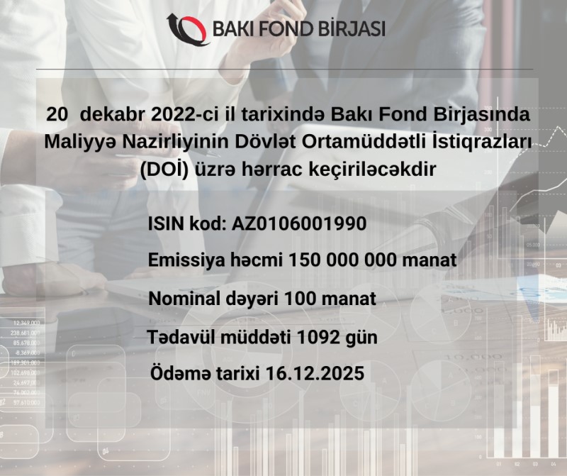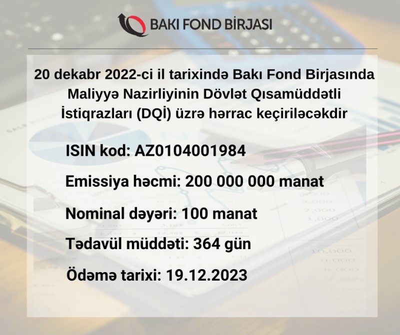 20 dekabr 2022-ci il tarixində Bakı Fond Birjasında Maliyyə Nazirliyinin 200 milyon manatlıq Dövlət Qısamüddətli İstiqrazları (DQİ) üzrə hərrac keçiriləcəkdir.