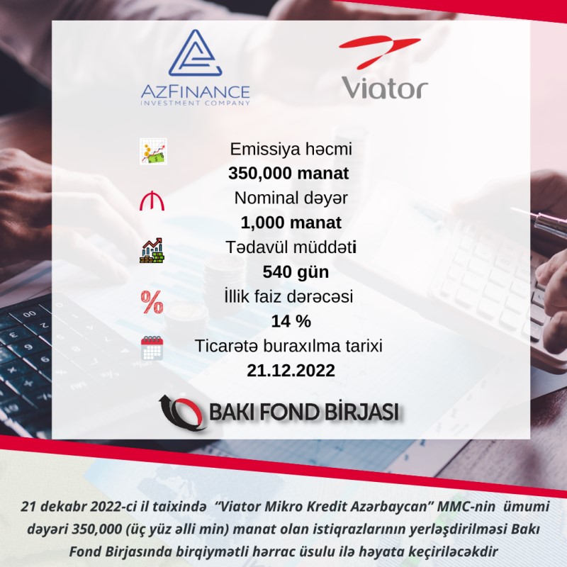 21 noyabr 2022-ci il tarixində Bakı Fond Birjasının (BFB) Listinq Komitəsinin qərarı ilə BOKT “Viator Mikro Kredit Azərbaycan” MMC-nin ümumi dəyəri 350 min manat olan istiqrazları standart bazar seqmentində listinqə daxil edilib.