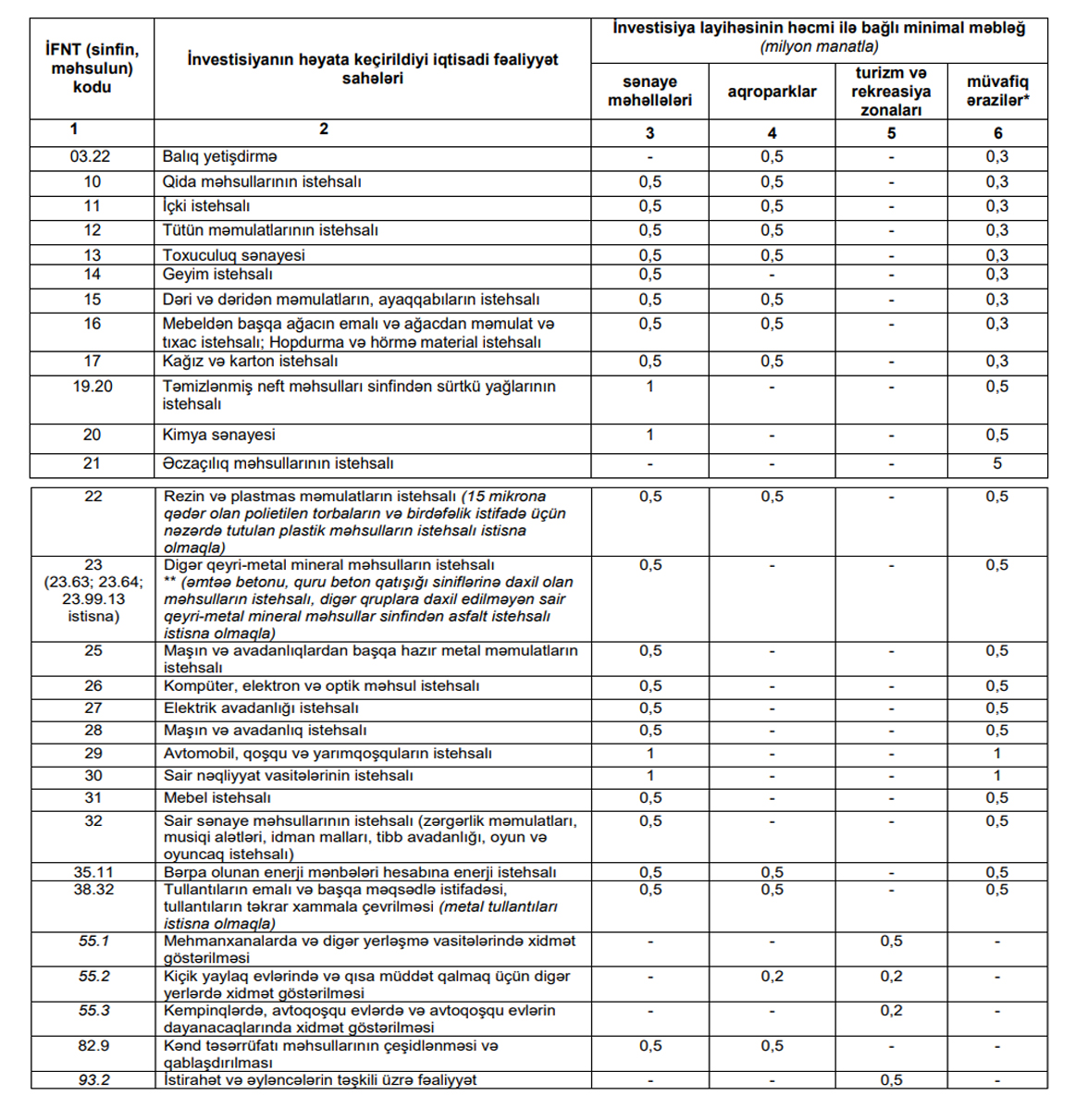 İFNT (sinfin, məhsulun) kodu | İnvestisiyanın həyata keçirildiyi iqtisadi fəaliyyət sahələri | İnvestisiya layihəsinin həcmi ilə bağlı minimal məbləğ (milyon manatla) | |||