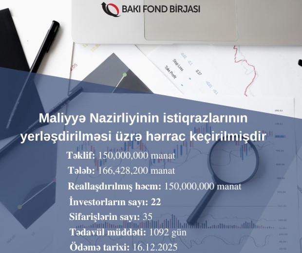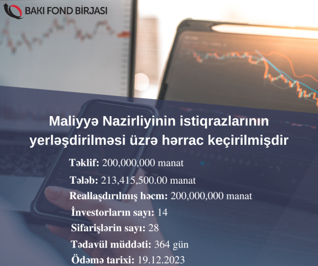 Həmçinin, 20 dekabr 2022-ci il tarixində Bakı Fond Birjasında Azərbaycan Respublikası Maliyyə Nazirliyinin AZ0106001990 ISIN-li, 150 milyon manat həcmində, 1092 gün olan tədavül müddətli dövlət ortamüddətli istiqrazlarının (DOİ) yerləşdirilməsi üzrə hərrac keçirilib.