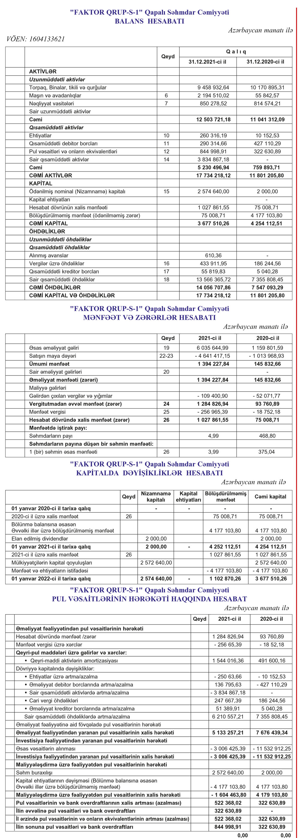31 dekabr 2021-ci il tarixində "Faktor Qrup-S-1" QSC 17 miylon 734 min manat vəmi aktivlərə malik olub (2020 ilin sonunda 11 milyon 801 min manat).