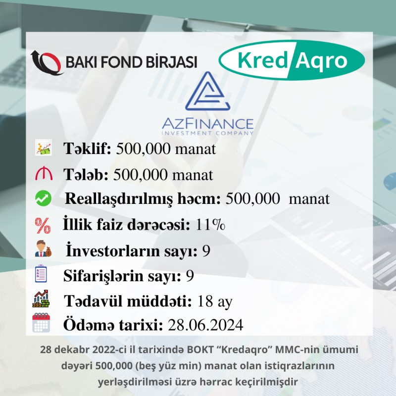 28 dekabr, 2022-ci il tarixində Bakı Fond Birjasında BOKT “Kredaqro” MMC-nin tədavül müddəti 18 ay, nominal dəyəri 100 manat olan AZ2003009167 dövlət qeydiyyat nömrəli, 500 min manat həcmində, faizli, təmin edilməmiş sənədsiz, adlı istiqrazlarının yerləşdirilməsi üzrə hərrac yekunlaşıb.