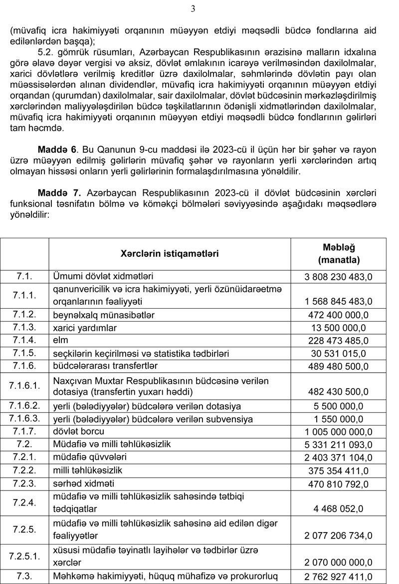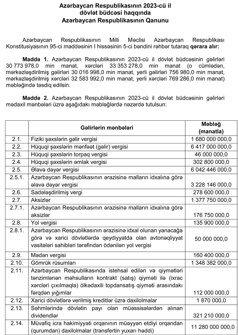Marja.az xəbər verir ki, Azərbaycan Respublikasının 2023-cü il dövlət büdcəsinin gəlirləri 30 milyard 773 milyon 978 min manat, xərcləri 33 milyard 353 milyon 278 min manat (o cümlədən, mərkəzləşdirilmiş gəlirləri 30 milyard 16 milyon 998 min manat, yerli gəlirləri 756 milyon 980 min manat, mərkəzləşdirilmiş xərcləri 32 milyard 583 milyon 992 min manat, yerli xərcləri 769 milyon 286 min manat) məbləğində təsdiq edilib.