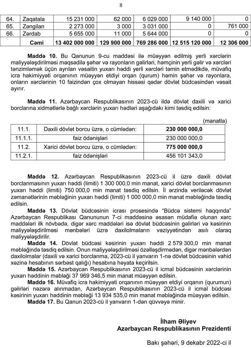 Prezident İlham Əliyev "Azərbaycan Respublikasının 2023-cü il dövlət büdcəsi haqqında Azərbaycan Respublikasının Qanunu" imzalayıb.