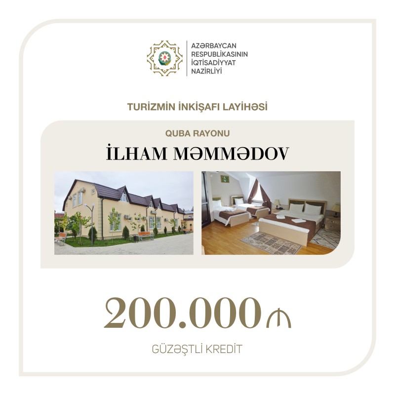 Sahibkar İlham Məmmədov Quba rayonunda icrası nəzərdə tutulmuş turizmin inkişafı layihəsi üzrə Sahibkarlığın İnkişafı Fondundan 200 min manat güzəştli kredit əldə edib.