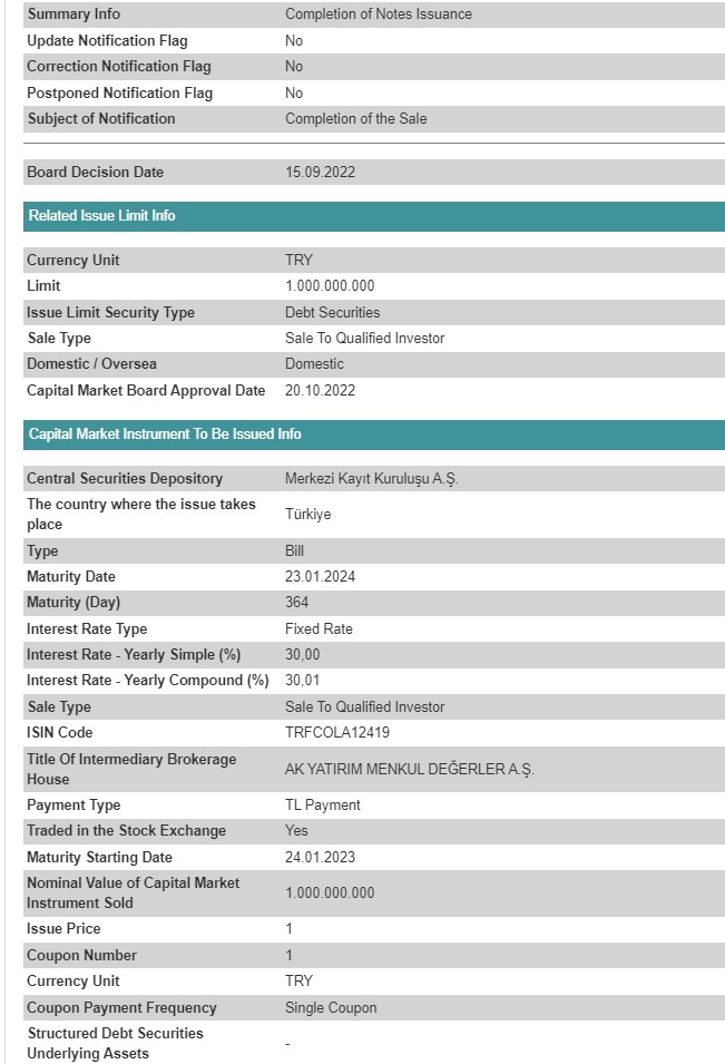 "Coca-Cola İçecek AŞ" 1 milyard Türk lirəsi (TL) məbləğində (cari məzənnə ilə 90 milyon 400 min manat ) istiqrazlar buraxıb.