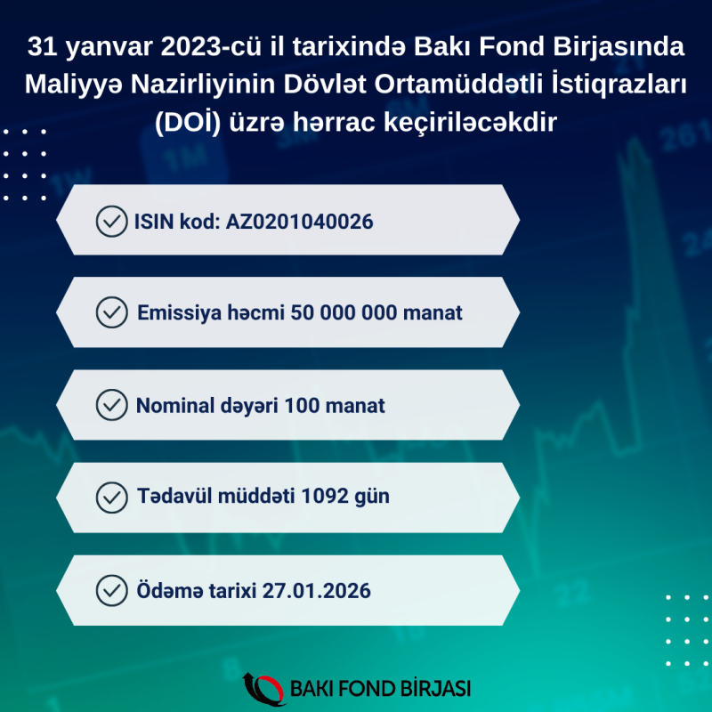 (®) 31 yanvar 2023-cü il tarixində Bakı Fond Birjasında Maliyyə Nazirliyinin 50 milyon manatlıq Dövlət Ortamüddətli İstiqrazları (DOİ) üzrə hərrac keçiriləcəkdir.