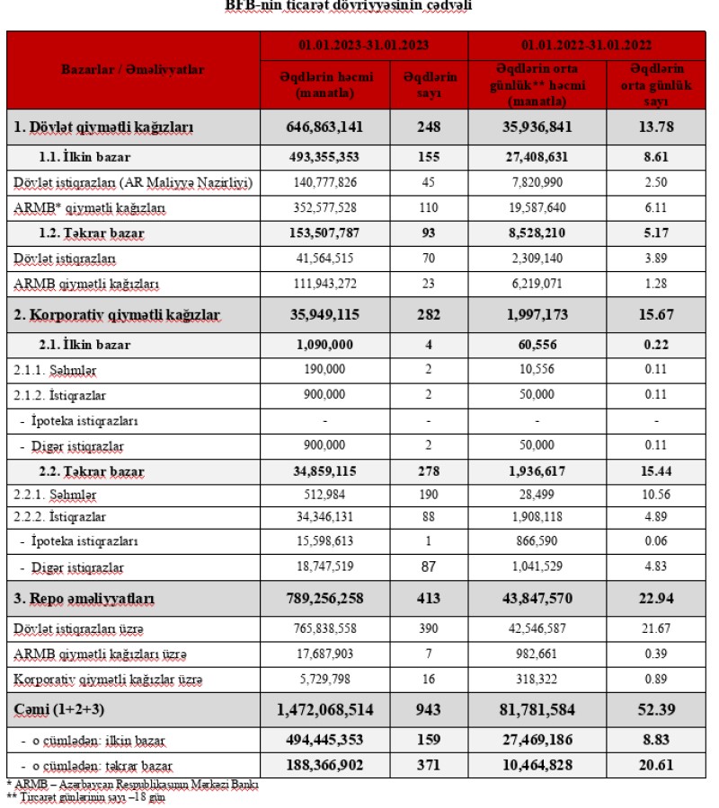 Bakı Fond Birjasında 2023-ci ilin yanvar ayı ərzində qiymətli kağızlar üzrə keçirilən əməliyyatların ümumi həcmi 1 milyard 472 milyon 68 min manat təşkil etmişdir.