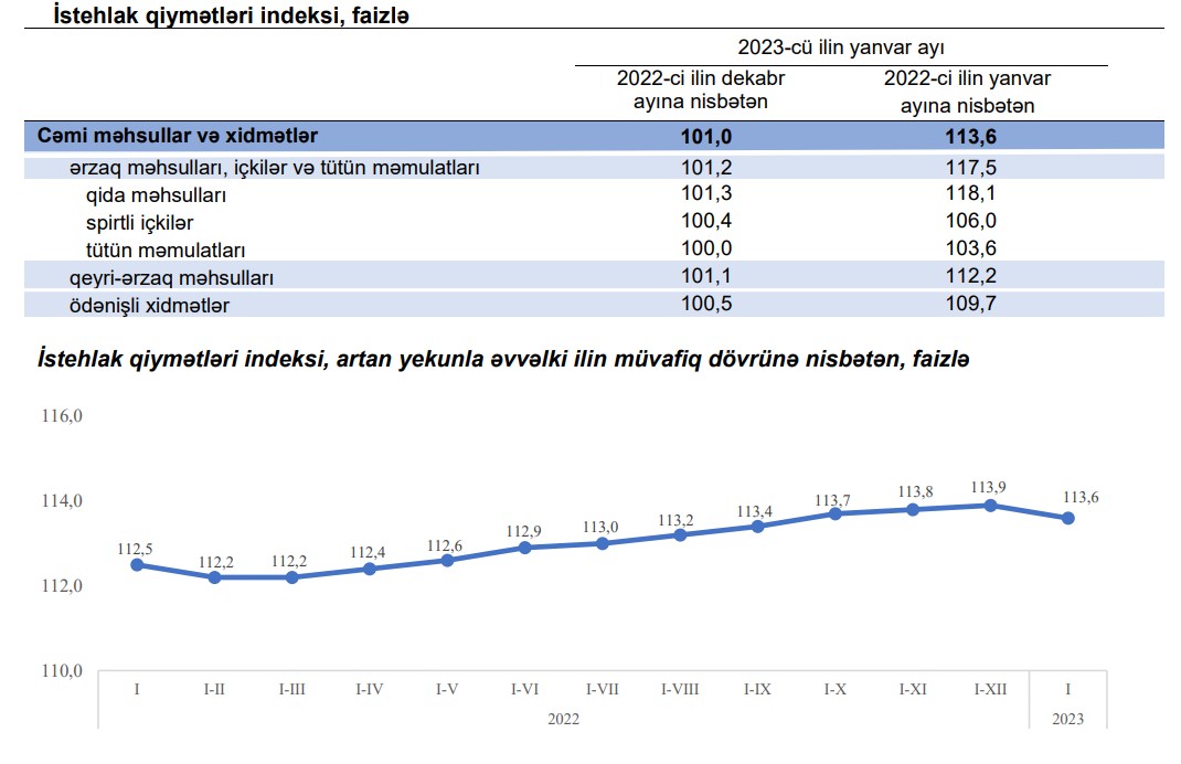 İnflyasiyanın sürəti 13,9 faizdən 13,6 faizə düşüb2023-cü ilin yanvar ayında istehlak qiymətləri indeksi (inflyasiya göstəricisi) 2022-ci ilin yanvar ayına nisbətən 13,6 faiz, o cümlədən ərzaq məhsulları, içkilər və tütün məmulatları üzrə 17,5 faiz, qeyri-ərzaq məhsulları üzrə 12,2 faiz, əhaliyə göstərilmiş ödənişli xidmətlər üzrə 9,7 faiz artıb.