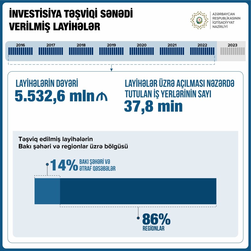 2016-2022-ci illər ərzində 470-dən çox sahibkarlıq subyektinə 570-dən artıq investisiya təşviqi sənədi verilib.