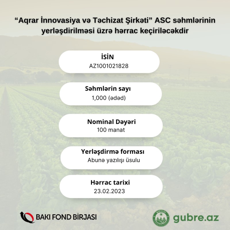 “Aqrar İnnovasiya və Təchizat Şirkəti”nin yeni səhmləri satılacaq -TİCARƏTƏ BURAXILMA TARİXİ