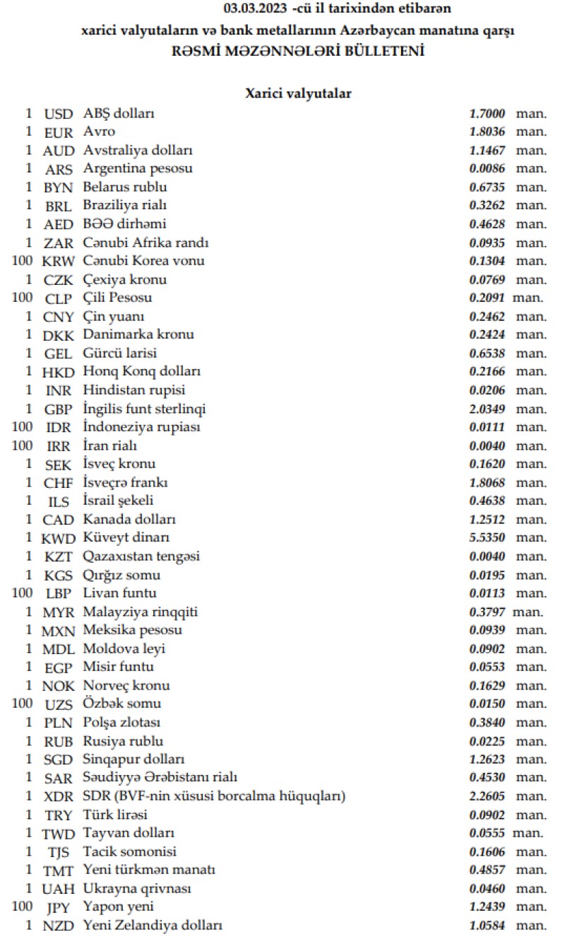 Rəsmi məzənnələr açıqlandı