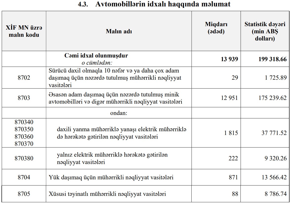 Ötən ilin ilk 2 ayında minik avtomobillərinin idxalı 10 min 340 ədəd ikən, 2023-cü ilin ilk 2 ayında 12 min 951 ədəd təşkil edib.
