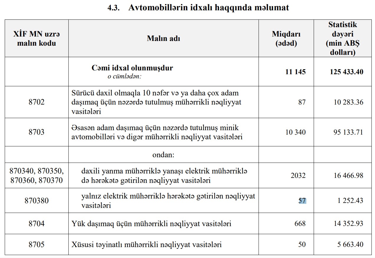 2022-cü ilin yanvar-fevral dövründə Azərbaycana 125 milyon 433 min dollar dəyərində 11 min 145 ədəd nəqliyyat vasitəsi idxal edilmişdi.