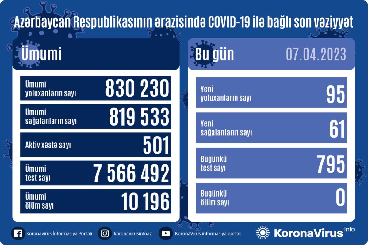 Azərbaycan Respublikasında koronavirus (COVID-19) infeksiyasına 95 yeni yoluxma faktı qeydə alınıb, 61 nəfər müalicə olunaraq sağalıb.