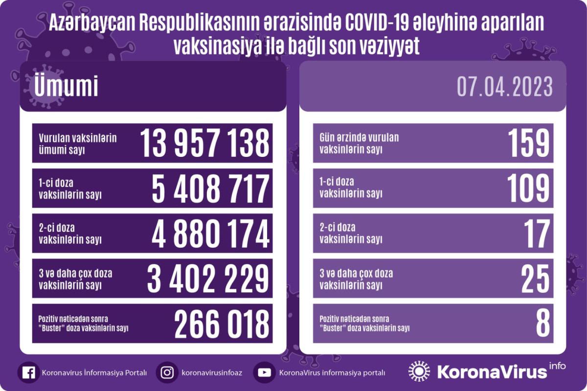 Azərbaycanda son sutkada koronavirus (COVID-19) əleyhinə 159 vaksin vurulub.