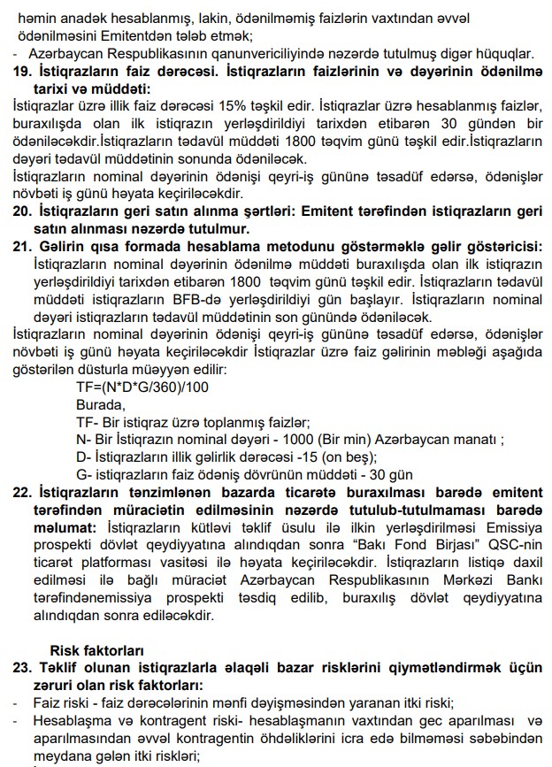 Marja.az xəbər verir ki. hər birinin nominal dəyəri 100 manat olan 500 ədəd faizli, təminatsız, sənədsiz, adlı istiqrazlarıb tədavül müddəti 1800 gün, illik faiz dərəcəsi 15%-dir. Faizlər hər 30 gündən bir ödəniləcəkdir.