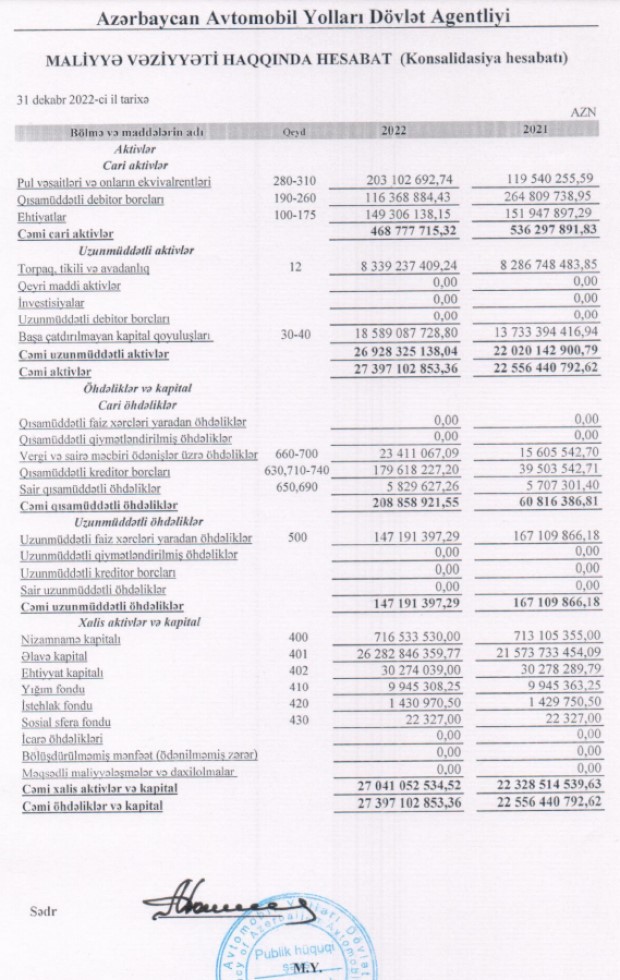 31 Dekabr 2022-ci il tarixində Avtomobil Yolları Dövlət Agentliyi 27 milyard 397 milyon 103 min manat cəmi aktivlərə malik olub. Agentlik 2021-ci ilin sonunda 22 milyard 556 milyon 441 min manat cəmi aktivlərə malik idi.