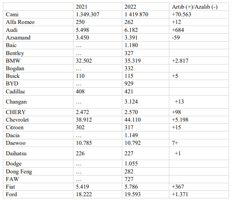 2022-ci ildə Azərbaycanda ən çox Toyota, Hyundai və KİA markalı avtomobillər artıb.Azərbaycanda dövlət qeydiyyatında olan minik avtomobillərinin sayı 2022-ci ildə 2021-ci illə müqayisədə 70 min 563 ədəd artaraq 31 dekabr 2022-ci il tarixində 1 milyon 419 min 870 ədədə çatıb.