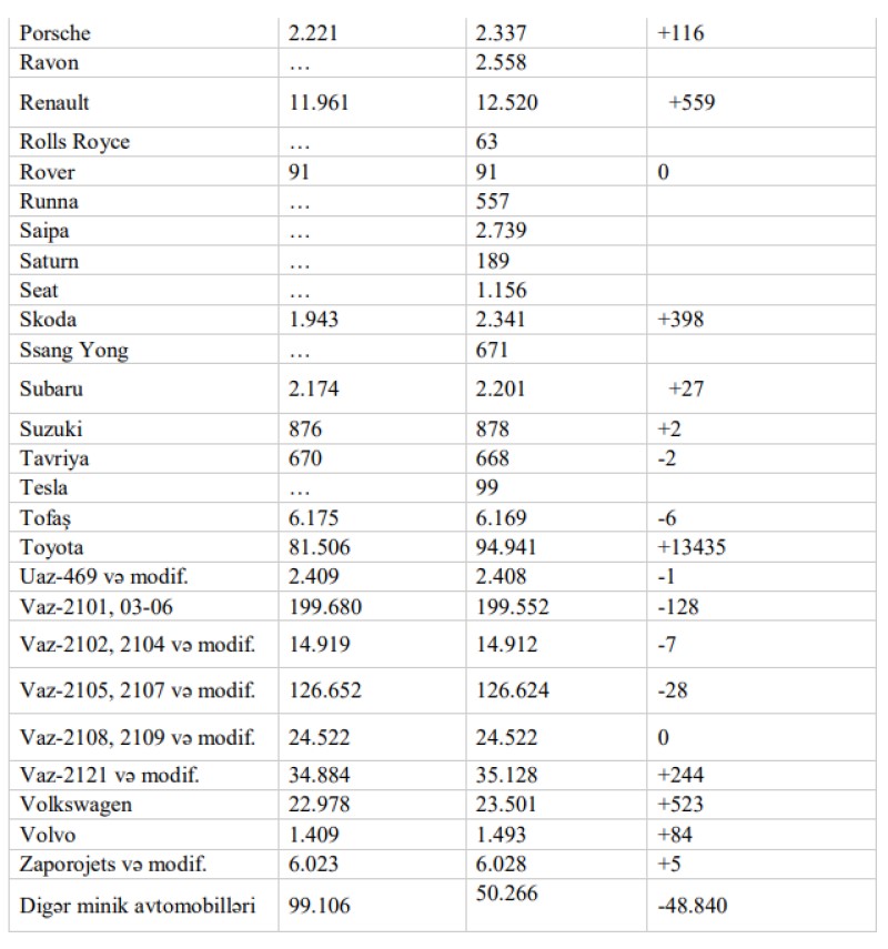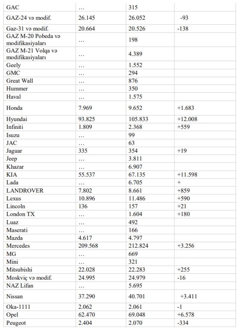 Marja.az-ın Dövlət Statistika Komitəsindən aldığı məlumata görə, ötən il Azərbaycanda ən çox Toyota (+13 min 435), Hyundai (+12 min 8), KİA (+11 min 598), Opel ( +6 min 578), Chevrolet (+5 min 198), Nissan (+3 min 411), Mercedes (+3 min 256), BMW (+2 min 817), Honda (+1 min 683), Ford (+1 min 371) və Land Rover (+859) avtomobillərinin sayı artıb.