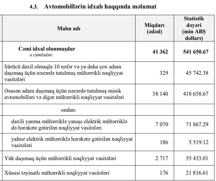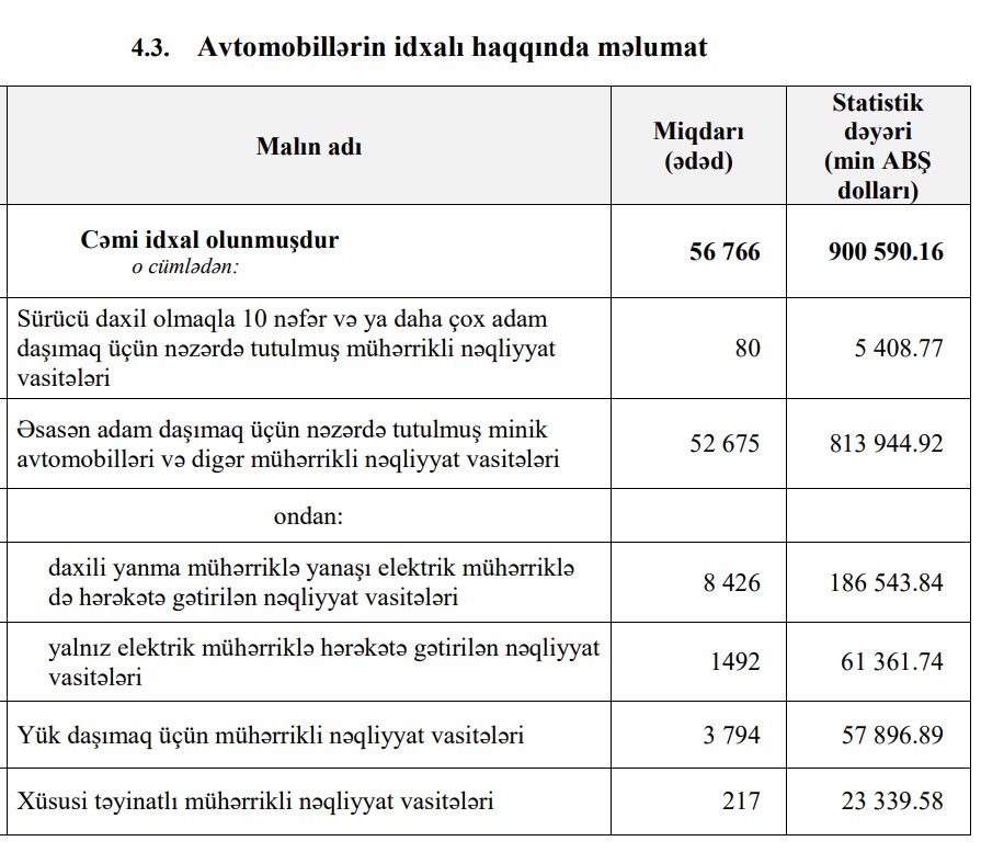 O cümlədən, 2023-cü ilin 7 ayında Azərbaycana 813 milyon 944 min dollar dəyərində 52 min 675 ədəd minik avtomobili, o cümlədən 61 milyon 361 min dollar dəyərində 1492 ədəd yalnız elektrik mühərriklə hərəkətə gətirilən nəqliyyat vasitəsi idxal olunub. Ötən ilin eyni dövründə 418 milyon 659 min dollar dəyərində 38 min 140 ədəd minik avtomobili, o cümlədən 186 ədəd yalnız elektrik mühərriklə hərəkətə gətirilən nəqliyyat vasitəsi idxal olunmuşdu.