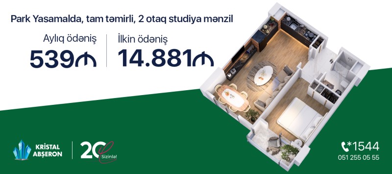 (®) “Kristal Abşeron” kirayə qiymətinə öz mənzilinə sahib olmağı təklif edir. “Park Yasamal”da 2, 3 və 4 otaqlı, tam təmirli, göl mənzərəli mənzillər satışdadır. Aylıq 539 manat ödəməklə 2 otaq studiya mənzil əldə edə bilərsiniz. İlkin ödəniş isə cəmi 14881 manatdır.