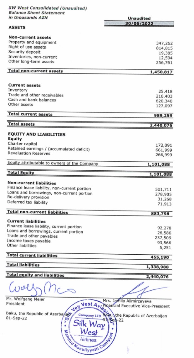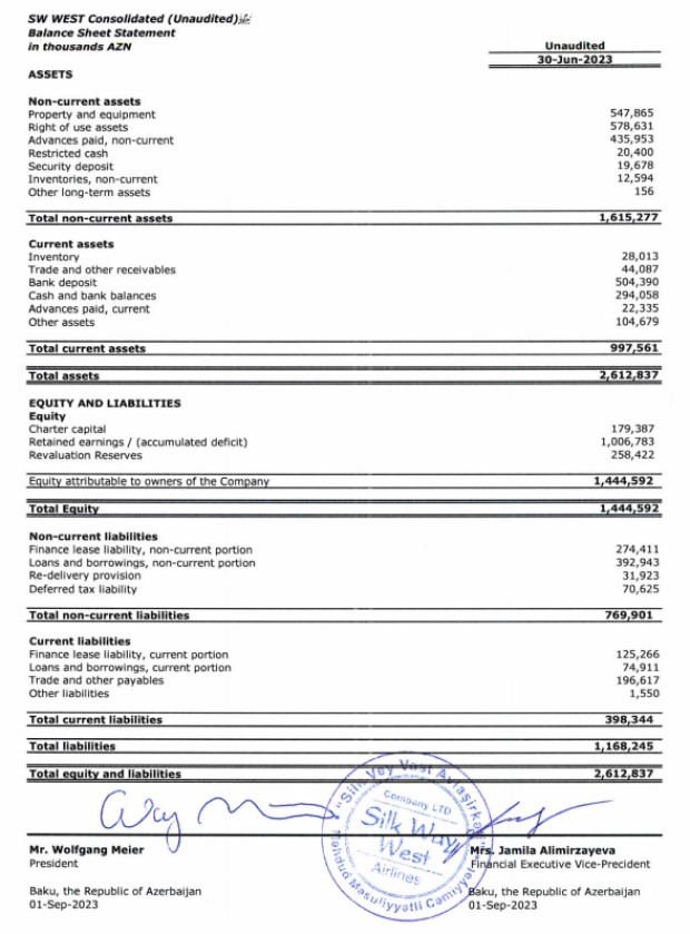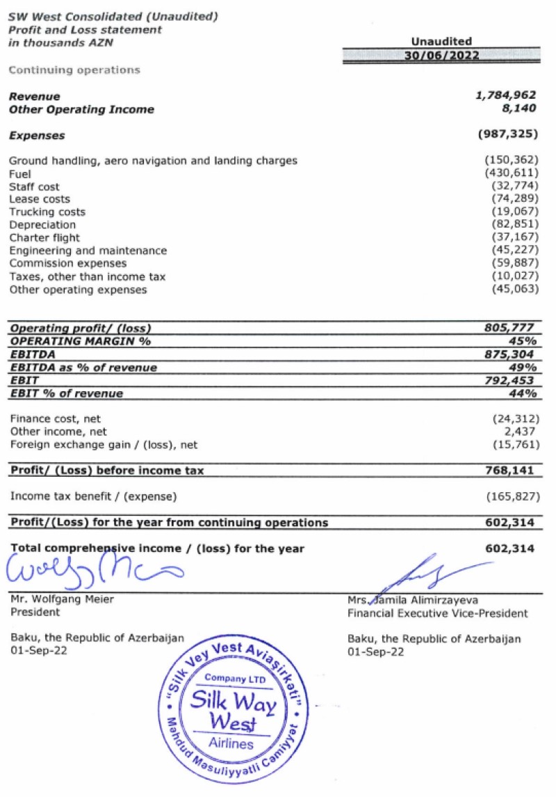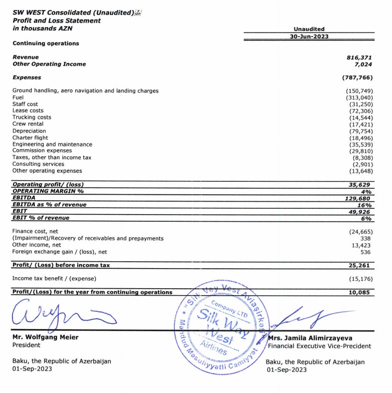 Marja.az xəbər verir ki, "Silk Vey Vest Aviaşirkəti"nin əsas əməliyyat gəlirləri 2022-ci ilin ilk 6 ayında 1 milyard 784 milyon 962 min manat ikən, 2023-cü ilin ilk 6 ayında 816 milyon 371 min manat olub (54,3% və ya 968 milyon 591 min manat azalıb).