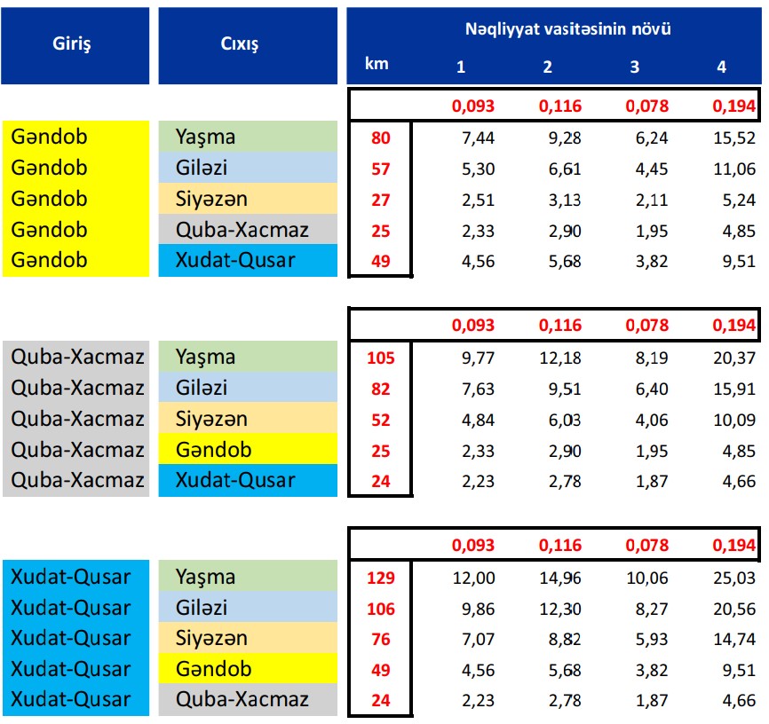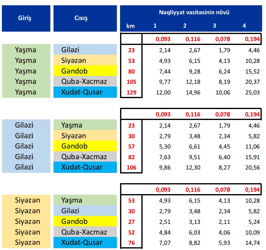 Avtonəqliyyat vasitələrinin növünə və müxtəlif məntəqələrə uyğun ödənişli yoldan istifadəyə görə QİYMƏT CƏDVƏLİ: